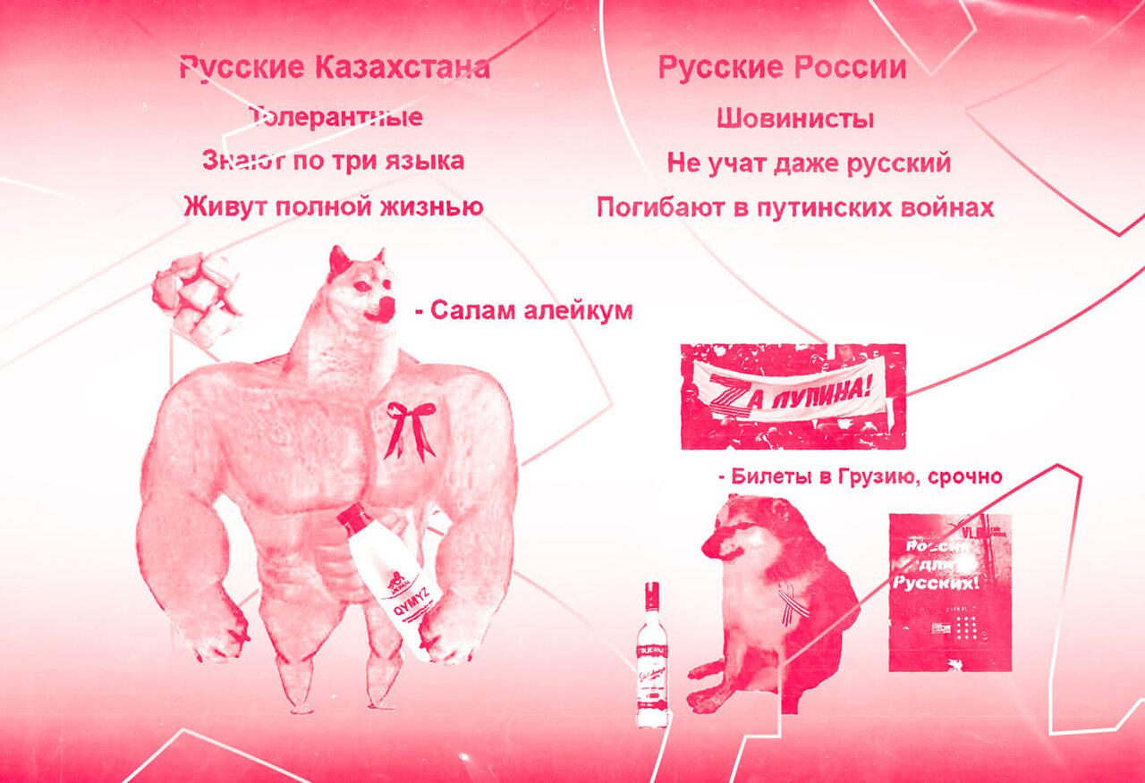 Alexey Skalozubov posted a meme contrasting russkie Russians (i.e. Russians from Russia) with orys — using the Kazakh word for “Russian” to refer to his compatriots of Russian heritage. The meme depicted a strong, qymyz-drinking Shiba Inu as a representation of “tolerant” Kazakh-Russians who “know three languages,” alongside a weaker character representing “chauvinist” Russians from Russia who are either “dying in Putin’s war” or “buying tickets to Georgia.”